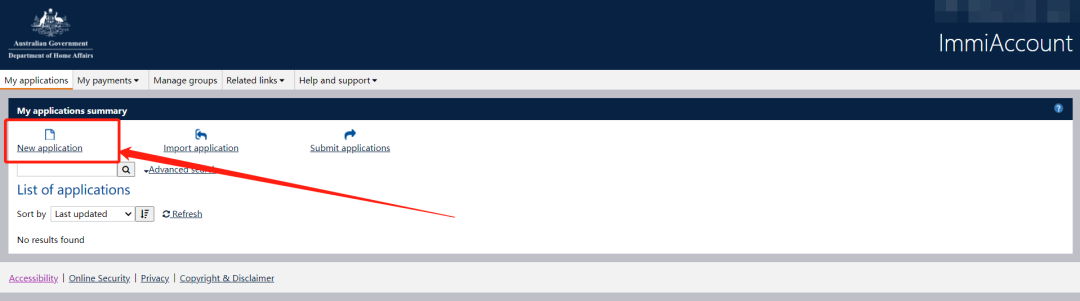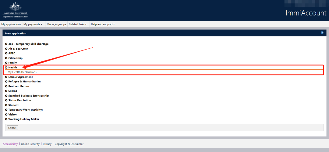 账户注册完成后,使用账号密码登录 ImmiAccount。登录后,在页面左侧菜单栏找到 “My application”(我的申请)选项,点击进入后,选择 “New Application”(新申请),在弹出的申请类型列表中,找到 “Health”(健康)分类,点击下方的 “My Health Declarations (MHD)”(我的健康声明),进入提前体检的申请页面。